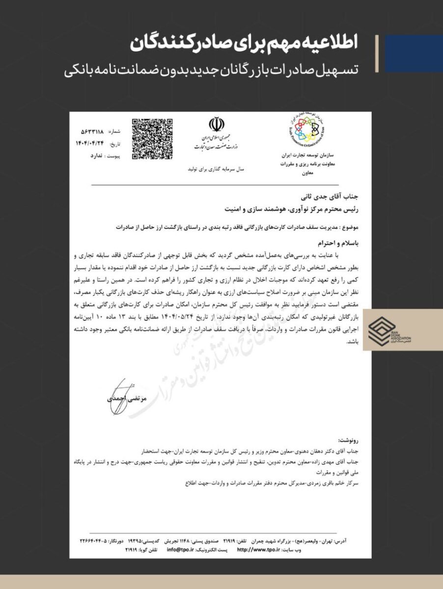 سازمان توسعه تجارت ایران اعلام کرد: اجرای بخشنامه شماره ۵۶۳۳۱۱۸ مورخ ۱۴۰۴/۰۴/۲۴ از ابتدای مهرماه ۱۴۰۴ عملیاتی خواهد شد. این بخشنامه با هدف مقابله با سوءاستفاده از کارتهای بازرگانی اجارهای و افزایش بازگشت ارز صادراتی تدوین شده است.