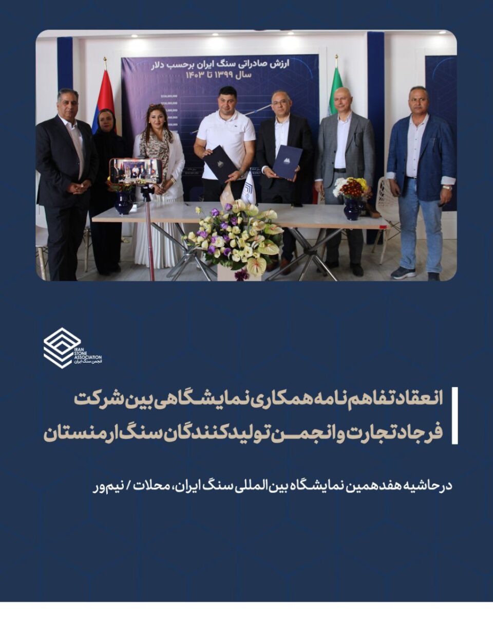 تفاهم نامه همکاری نمایشگاهی بین شرکت فرجاد تجارت و انجمن تولیدکنندگان سنگ ارمنستان به منظور توسعه حضور فعال در نمایشگاههای سنگ دو کشور منعقد گردید.