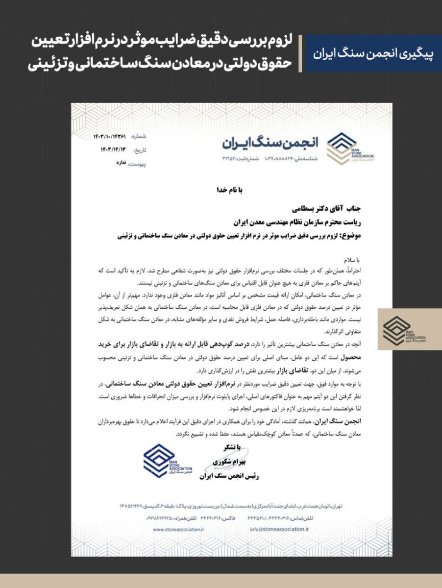 پیگیری انجمن سنگ ایران در ارتباط با ضرایب موثر در نرم افزار تعیین حقوق دولتی در معادن سنگ