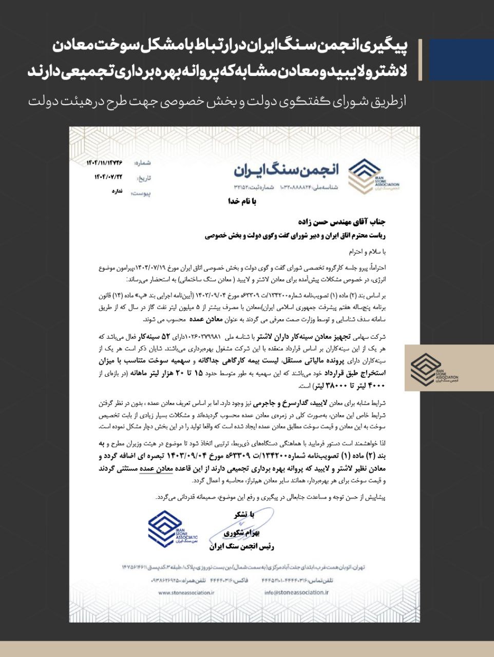 پیگیری انجمن سنگ ایران در ارتباط با مشکل سوخت معادن لاشتر و لایبید و معادن مشابه که پروانه بهره برداری تجمیعی دارند از طریق شورای گفتگوی