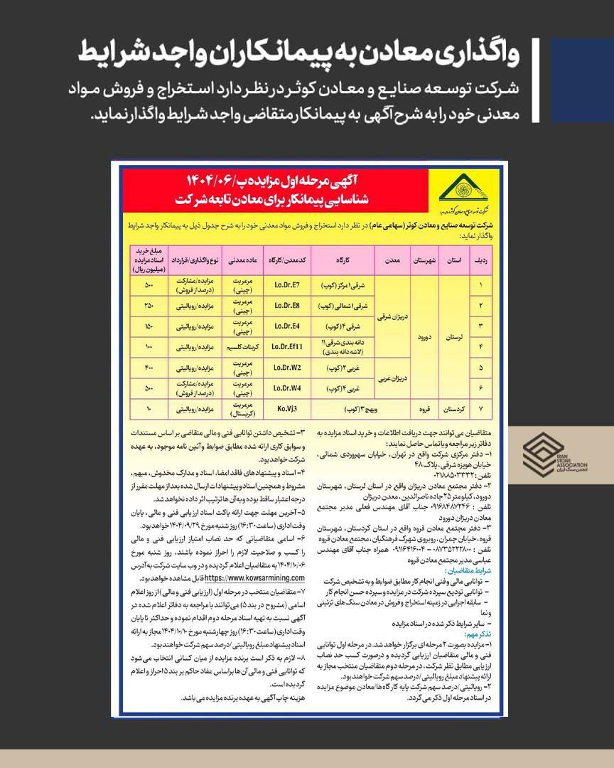 🔹شرکت توسعه صنایع و معادن کوثر در نظر دارد استخراج و فروش مواد معدنی خود را به شرح آگهی به پیمانکار متقاضی واجد شرایط واگذار نماید.